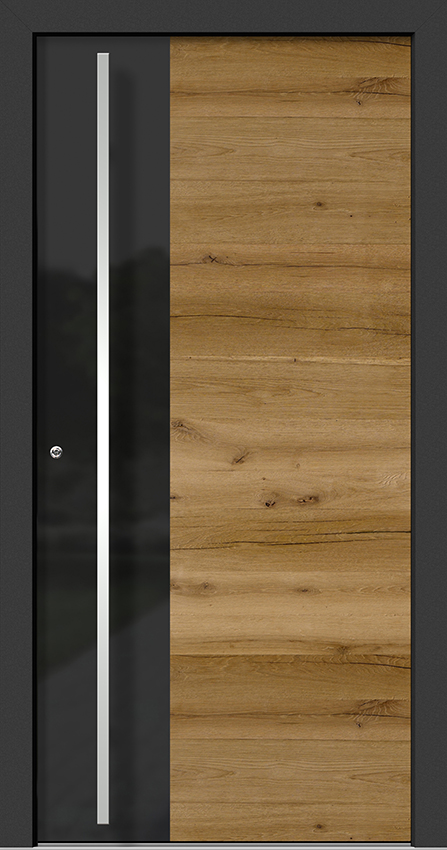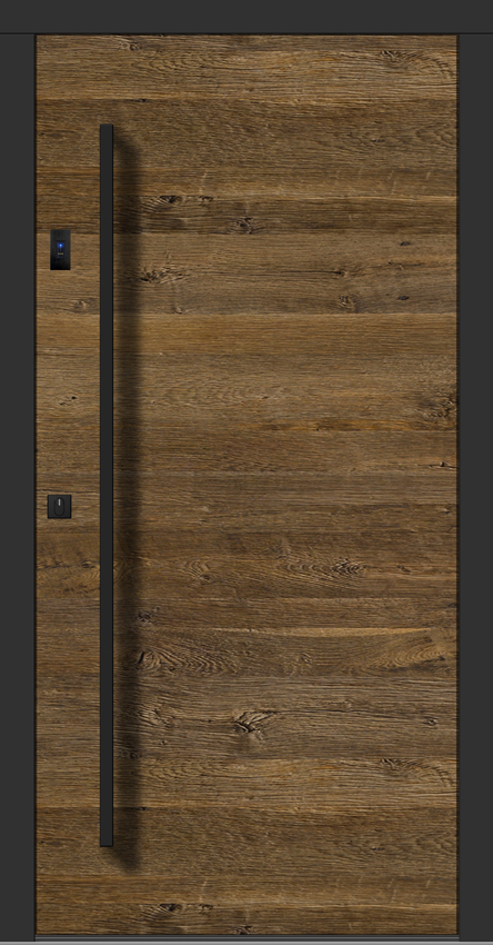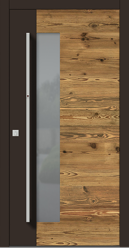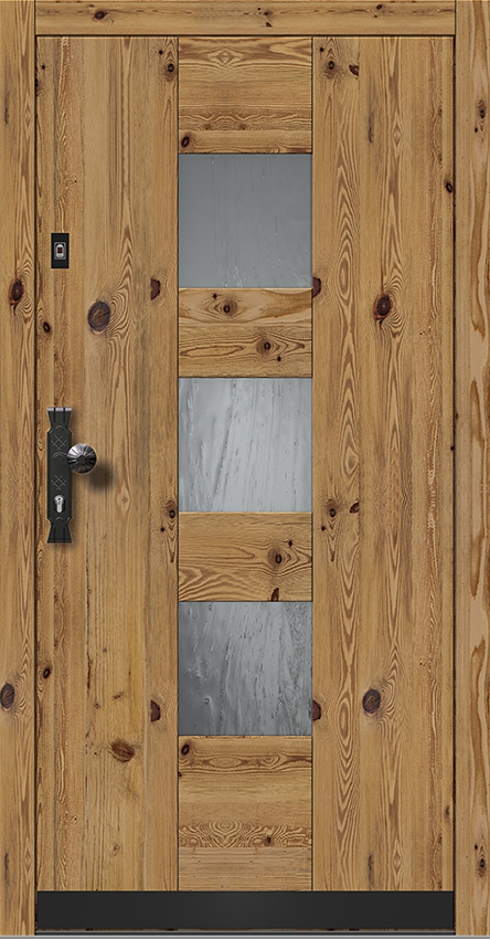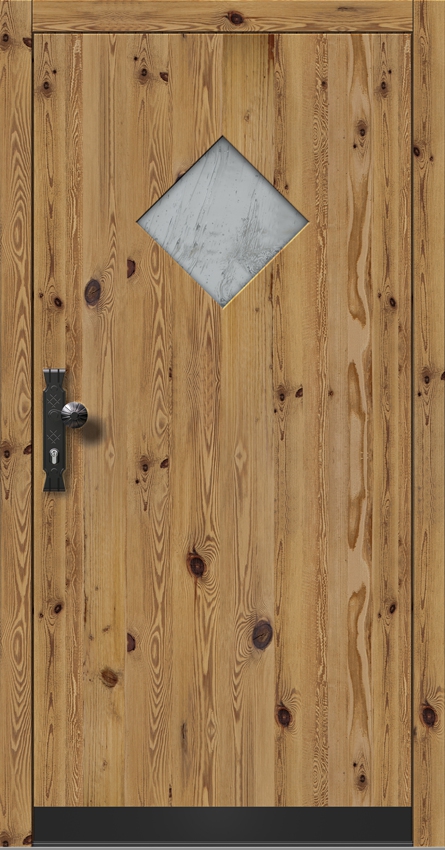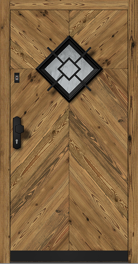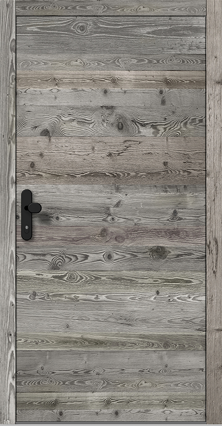 Türblatt ist außen mit 20 mm Stärke Altholz-Applikation überdeckt.